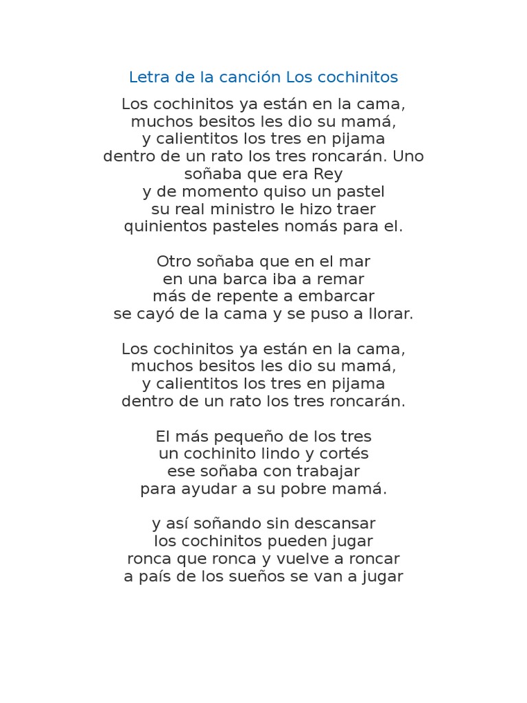 Un cochinito lindo y cortés. Letra de Cochinitos Dormilones Coro Los cochinitos ya están en la cama Muchos besitos les dió su mamá Y calientitos todos con pijama Dentro de un rato los tres roncarán Verso 1 Uno. El más grande les dijo a sus hermanos que sería bueno que se pusieran a construir sus propias casas para estar protegidos.